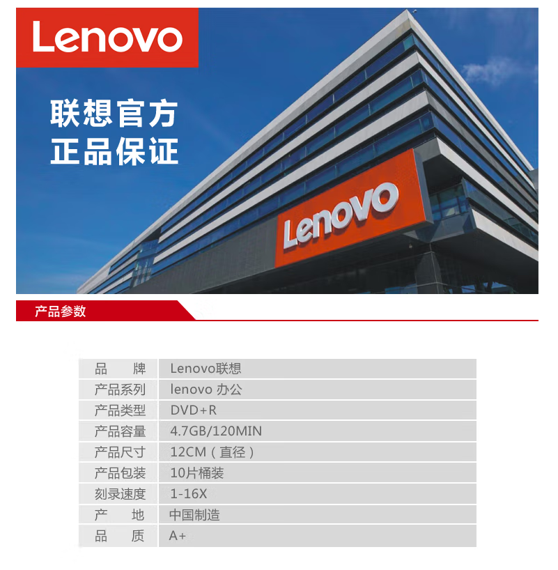 联想(Lenovo) DVD+R 光盘/刻录盘 办公系列 桶装10片 空白光盘