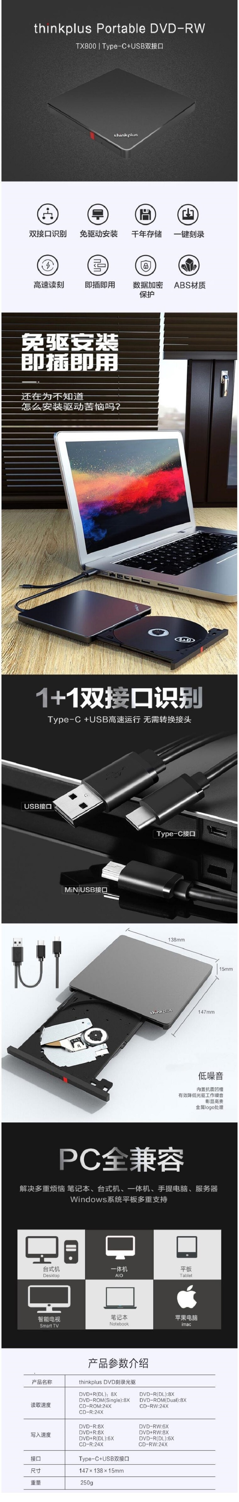 联想(Lenovo) TX800 超薄外置DVD刻录机 外置光驱Type-C+USB双接口