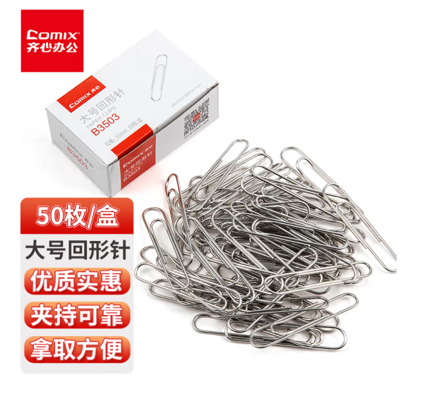 齐心(COMIX) 大号回形针/曲别针 50mm 镍防锈 50枚/盒 B3503