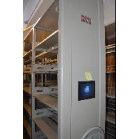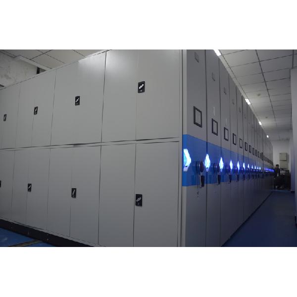 密集架主要由导轨、底盘、传动机构和架体(包括立柱、挂板、搁板、顶板、门板、侧护板、防鼠板、防尘板)等零(部)件组成。架顶设有防尘装置、列与列之间装有特种抗老化橡塑磁性密封条,形成两列间的全封闭,门面列和中间移动列分别装有锁具和制动装置,每组密集架闭合后可用总锁锁住,形成一个封闭的整体,底部设有防鼠、防倾倒装置,整个架体具有良好的防尘、防鼠、防潮、防火阻燃、防盗和保密功能。