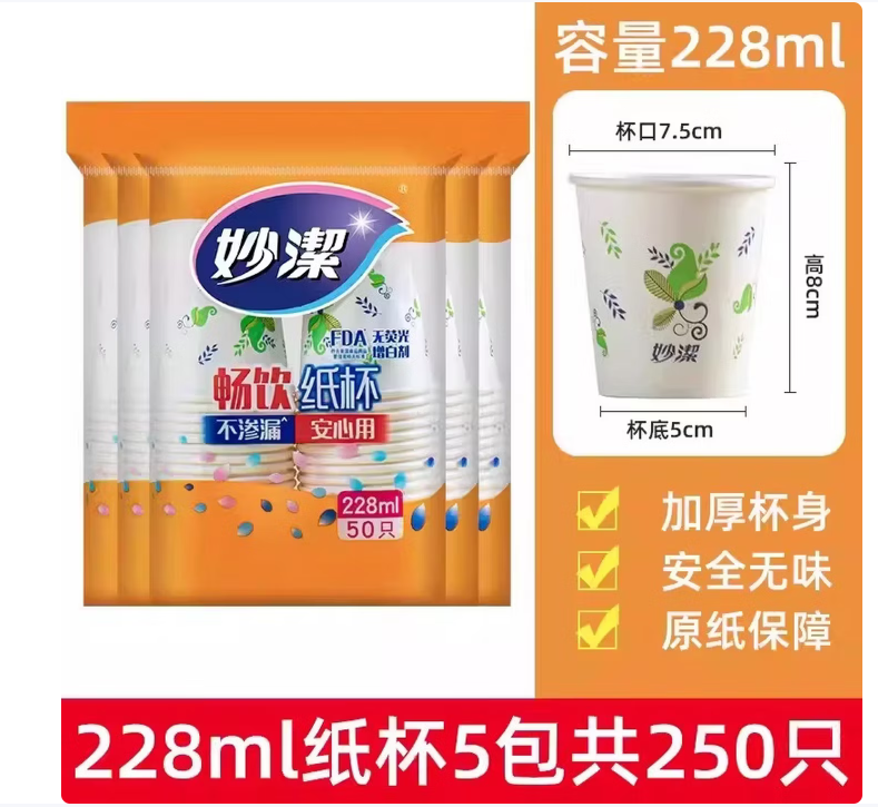 妙洁 一次性纸杯水杯子228ml家用办公商用 5包共250只