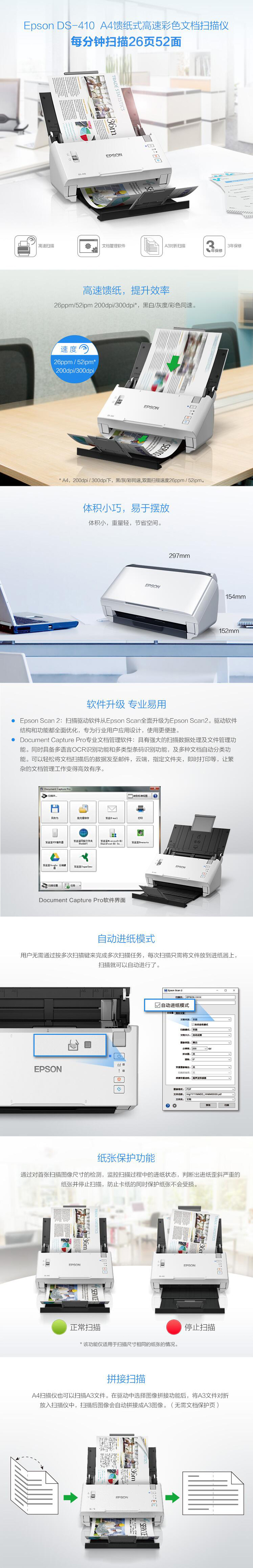 爱普生(EPSON) DS-410 A4馈纸式 高速彩色文档扫描仪 自动进纸